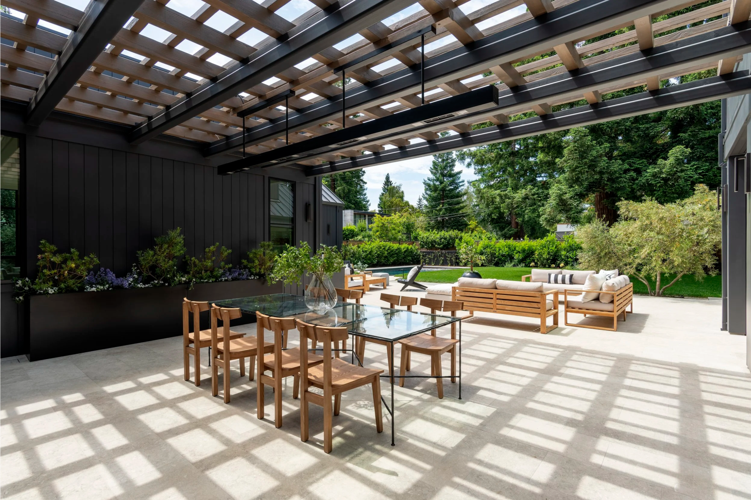 Located in the heart of Menlo Park, this transitional style house has clean-edged contemporary lines. The floor plan has an open design capturing abundant south-facing natural light filtering into the common areas' expansive to-the-floor windows and disappearing walls of glass. A pergola off of the common areas defines an "outdoor room". The interior is tied together with natural finish rift-sawn white oak floors and cabinetry. The exterior material palette consists of darkened wood siding combined with color-matching metal roofing for a bold modern look and massing. A lack of eaves reinforces the minimalist approach.