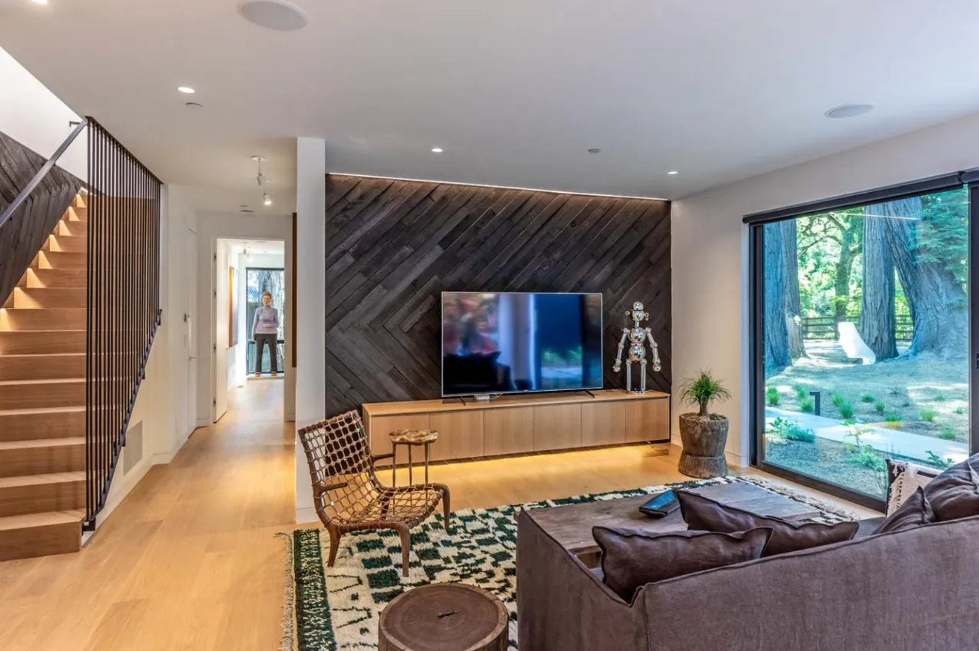 A modern barn house having gabled mass forms connected with glazed passageways. The owners wanted an open plan house with minimal detail that connects to the beautifully wooded natural surroundings in Woodside. One wing with a full basement has a lightwell that serves a common game room. The house exterior is clad with Shou Sugi Ban wood siding, which combined with metal roofing renders the house very fire-resistant.